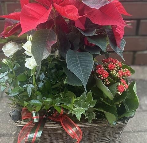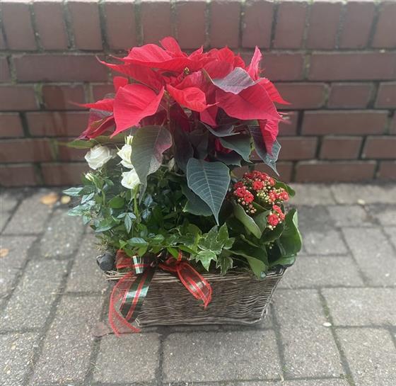 A mixed christmas planted selection, arranged in a basket-florist choice.