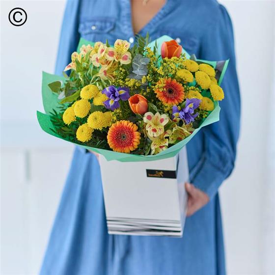 A handcrafted bouquet made by a local florist using the freshest blooms. This classic bouquet will feature flowers in vibrant shades inspired by spring. Think tangerine, cerise, chartreuse and ochre.