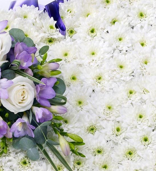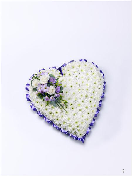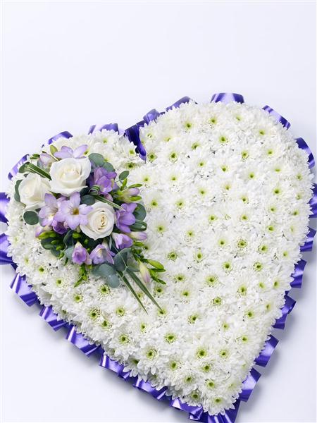 A classic heart-shaped design covered with a mass of white double spray chysanthemums and finished with a spray of white large-headed roses, lilac freesia and eucalyptus.