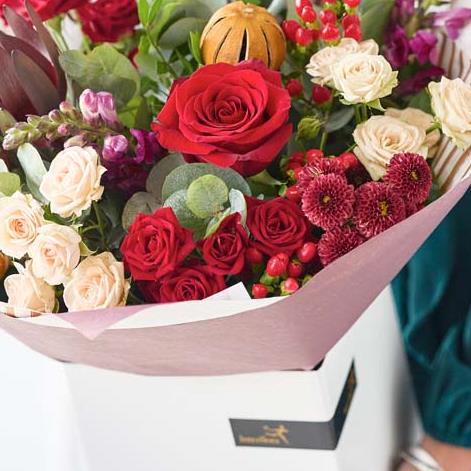 A gorgeous bouquet crafted by their local florist, featuring blooms in rich red and green shades, with peach and cream highlights and pops of burgundy and cerise.