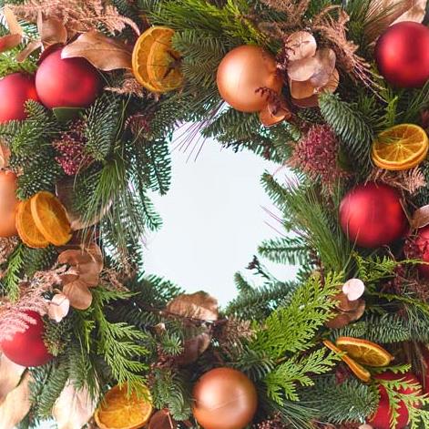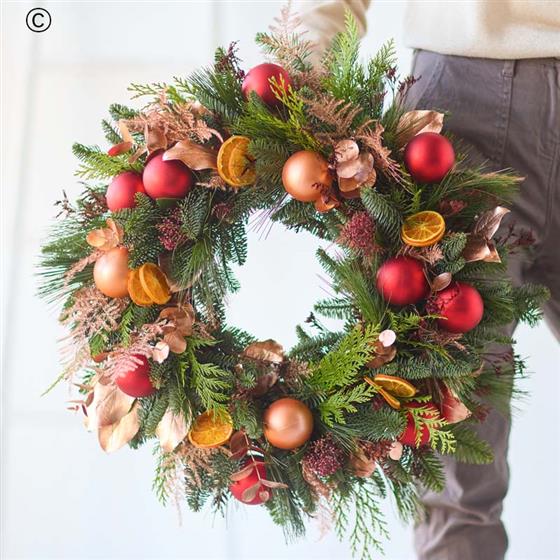 A classic Christmas wreath of fresh foliage and dried fruits, expertly arranged with care by a local florist.