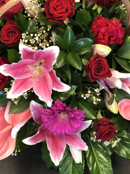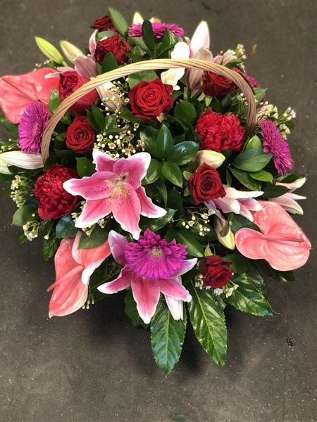 Choose from a range of colour options and we will create a traditional basket arrangement using seasonal blooms and foliage.