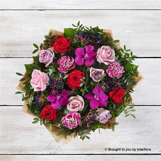 Featuring pink, lilac and red large headed roses, pink two-tone carnations and cerise vanda orchids, hand-tied with pistache, salal and viburnum, and presented in Interflora Gift Packaging.