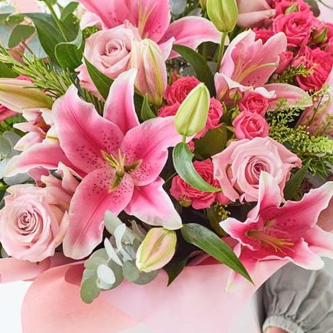 An abundance of pretty pink hues, this gorgeous bouquet features roses and lilies with complementary seasonal blooms exquisitely arranged and hand tied by a florist.