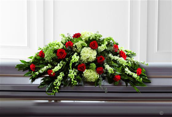 Rich red Rose and carnations are an eye-catching addition to a bed of white hydrangea, larkspur, antirrhinum, Queen Anne's lace and choice foliage to create a beautiful casket spray.