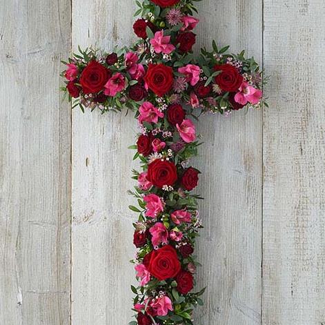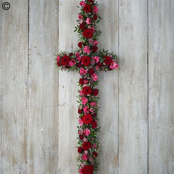 A cross featuring rich red and pink blooms including roses, alstroemeria and astrantia.