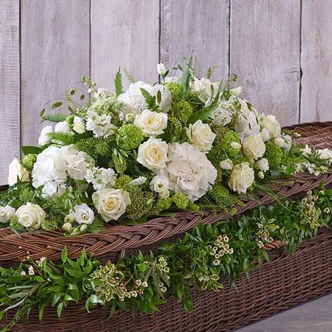 An elegant combination of our White Casket Spray, featuring the finest roses, stocks and hydrangeas, with a lush foliage garland dotted with dainty waxflower.