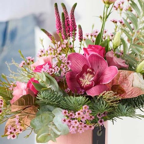 A beautiful of the moment Winter arrangement, just right for the table. It'll feature blooms in cerise and purple tones, with soft pink, peach or lilac shades. It might also feature dried flowers or foliage painted in copper or rose gold.