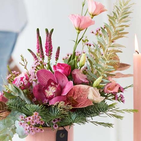 A seasonal winter arrangement featuring trending blooms and a central candle holder. Designed with warmth and style, perfect for cosy tables and thoughtful doorstep deliveries.