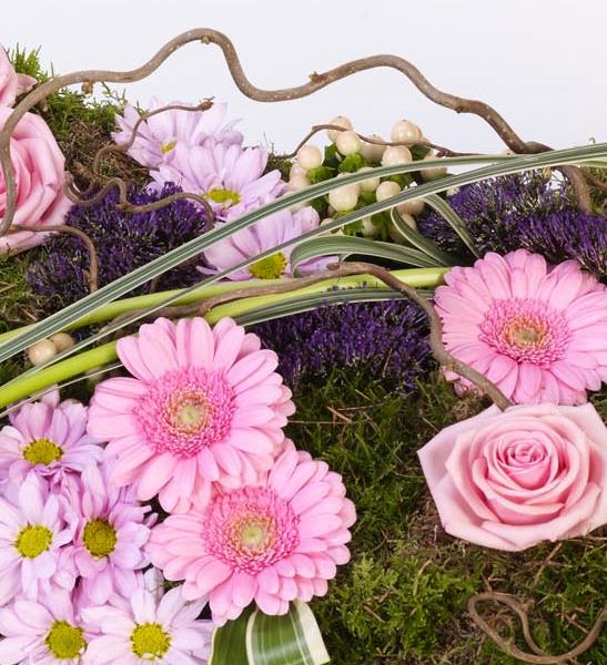 This pillow-shaped design has a woodland theme and includes pink large-headed roses, germini and spray chrysanthemums along with calla Lily and twisted hazel amongst an array of greenery.